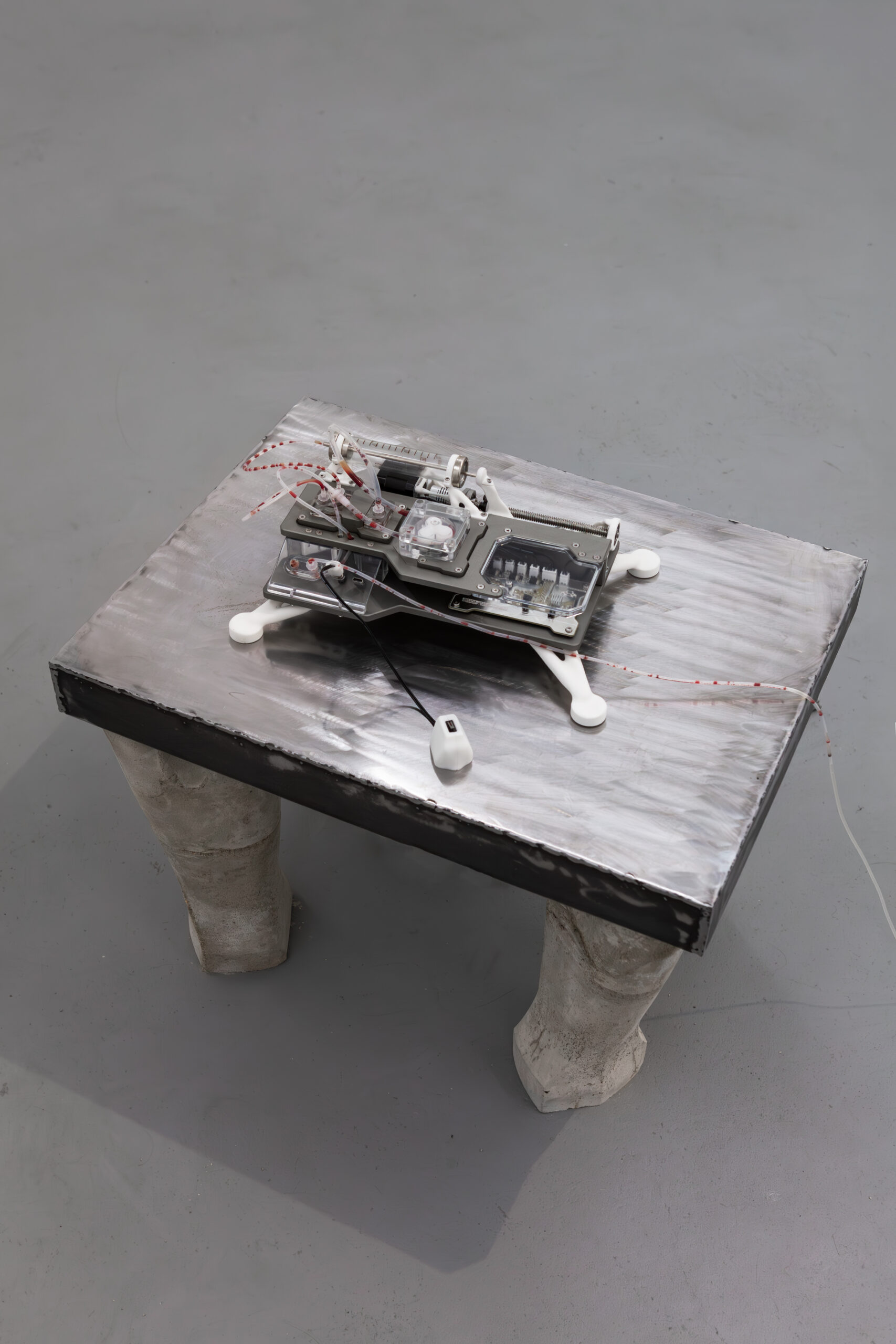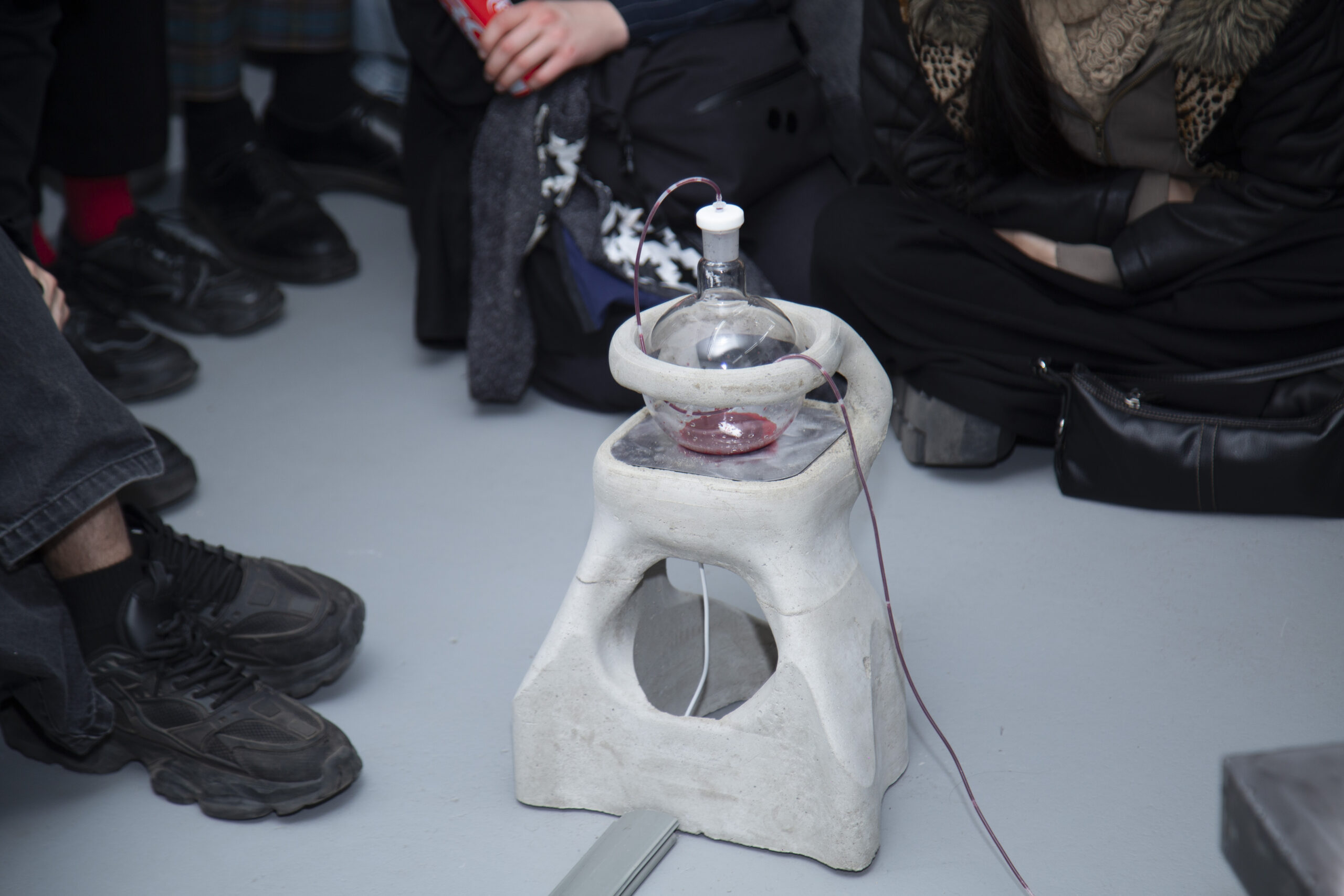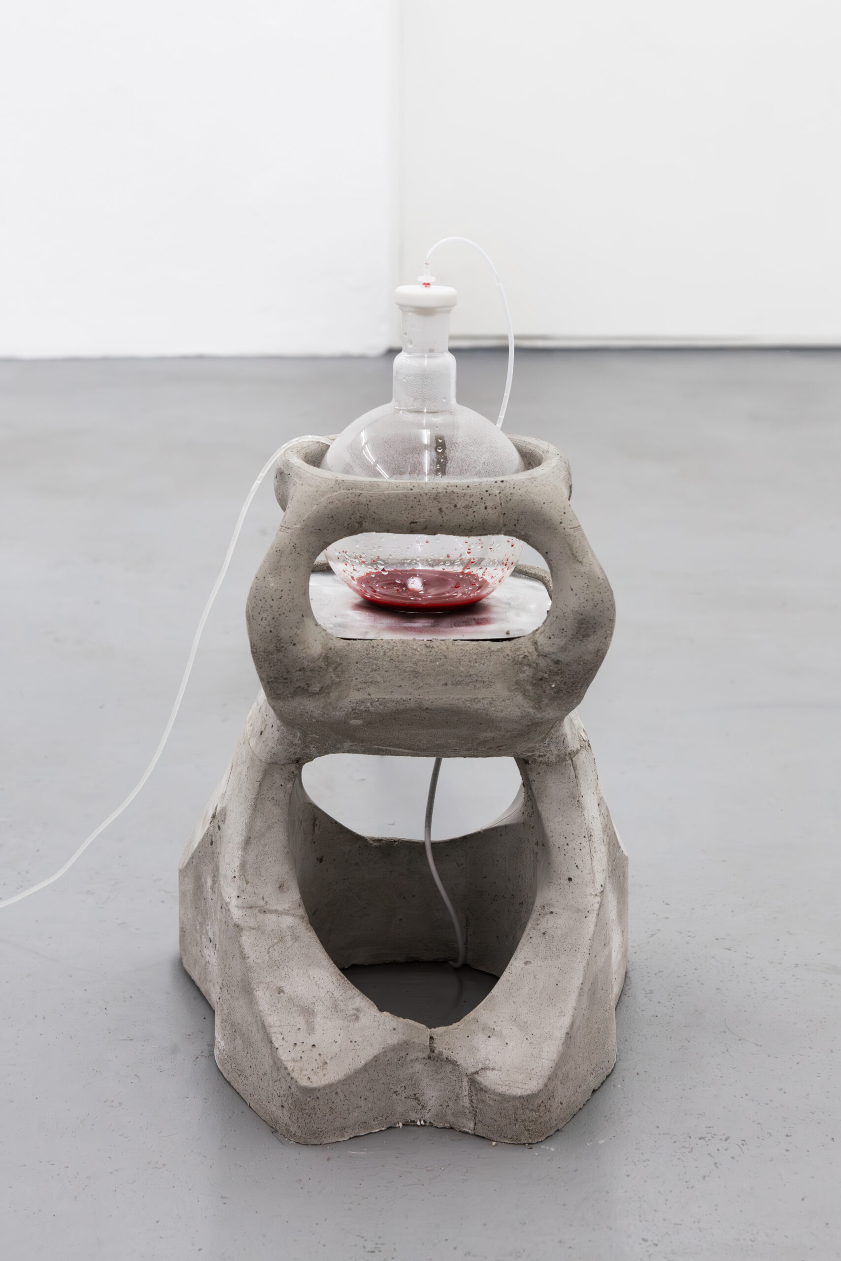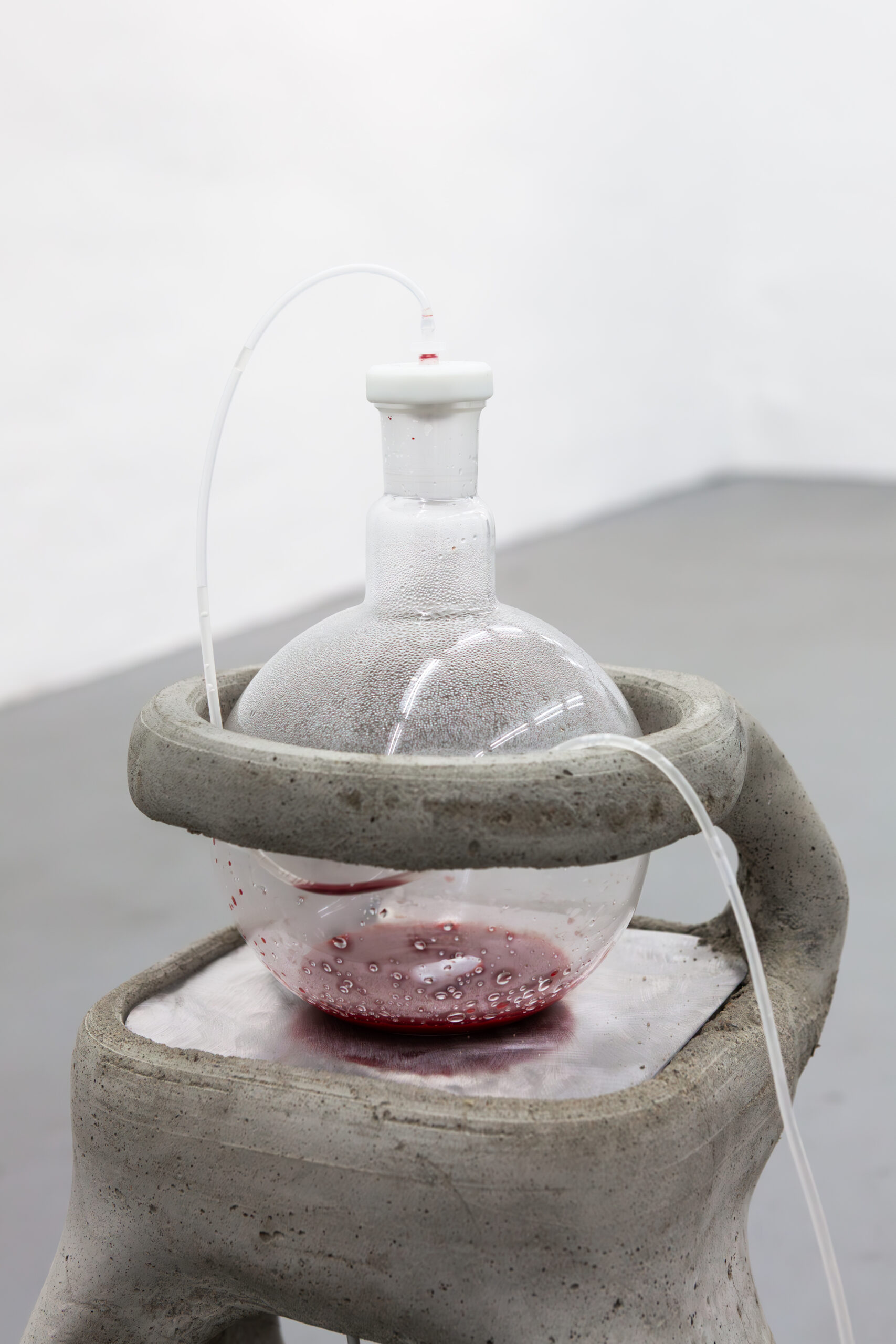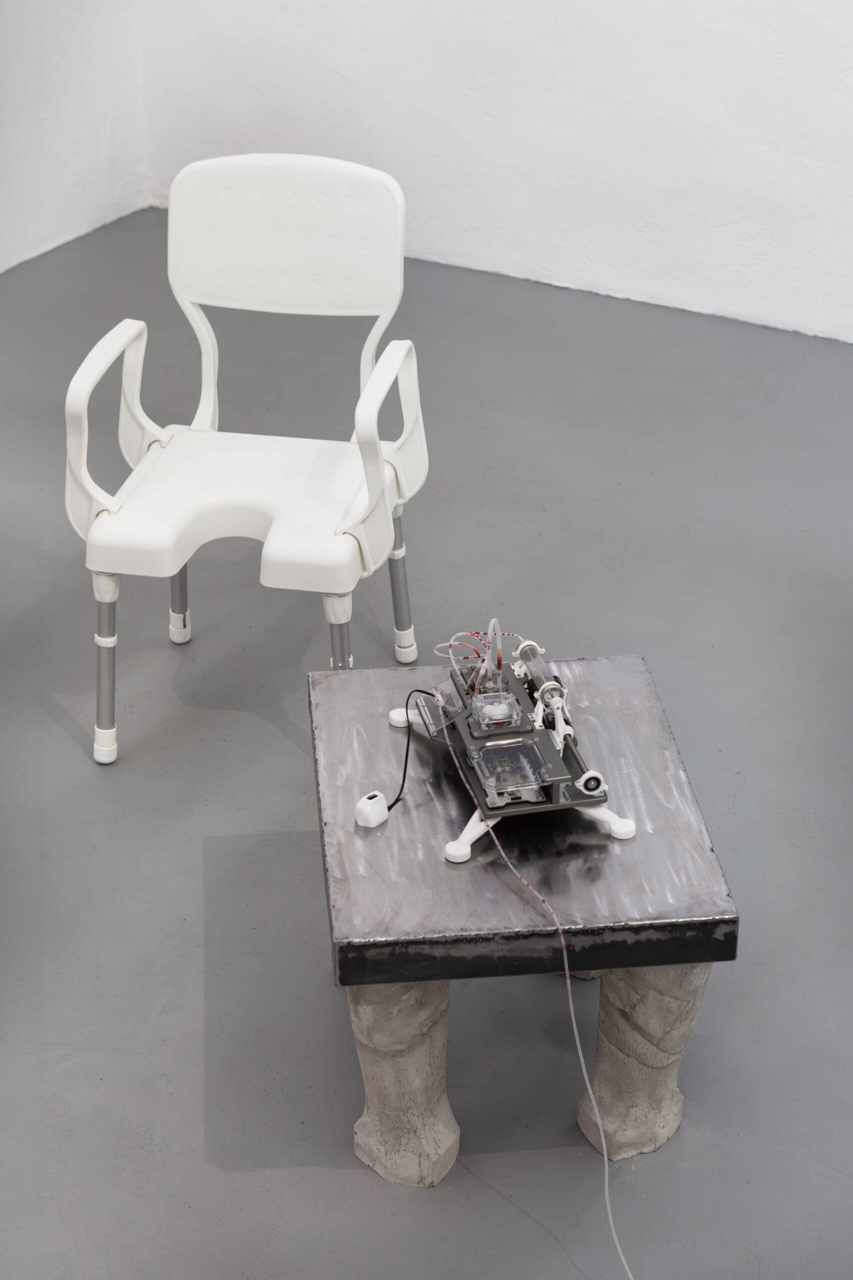 By activating uncanny and sci-fi-inspired technological objects, visually reminiscent of medical machines, Iron Stream exposes the connections between the individual materiality of blood and broader systems of power. It presents a continuous choreography between bodies, fluids, and machines that discloses the vicious management of life and death under capitalism.
