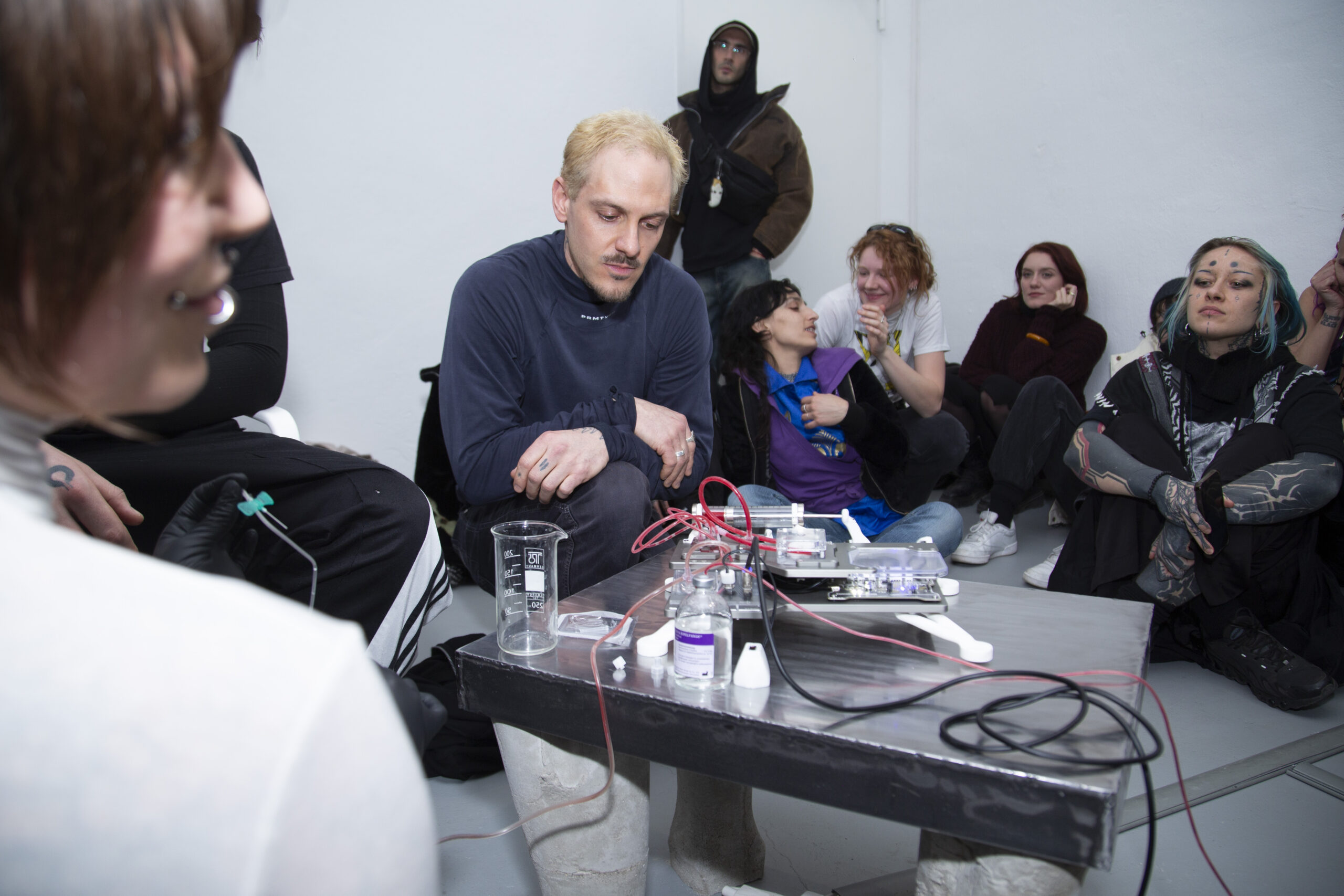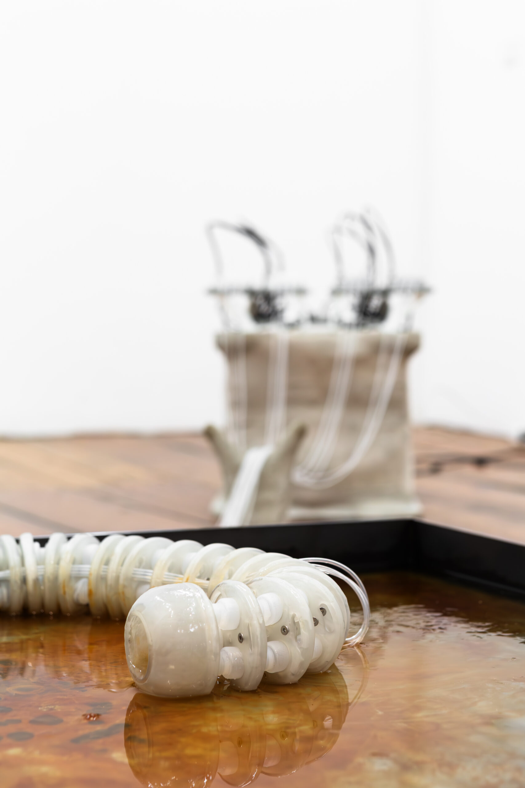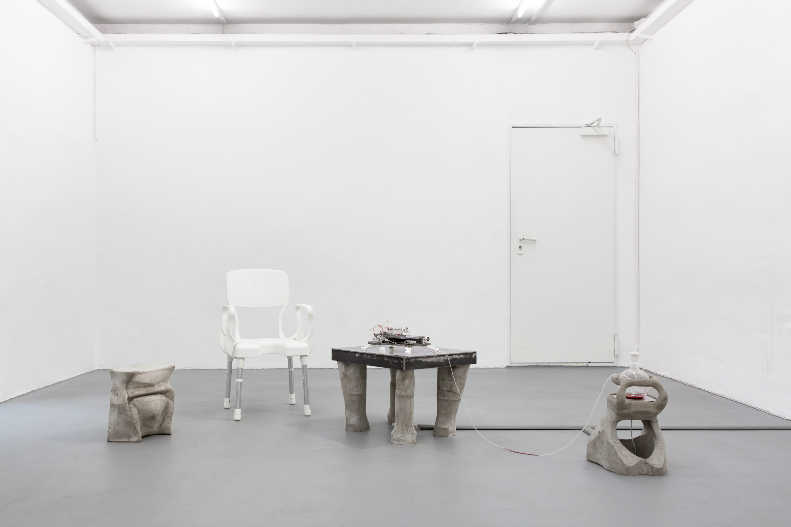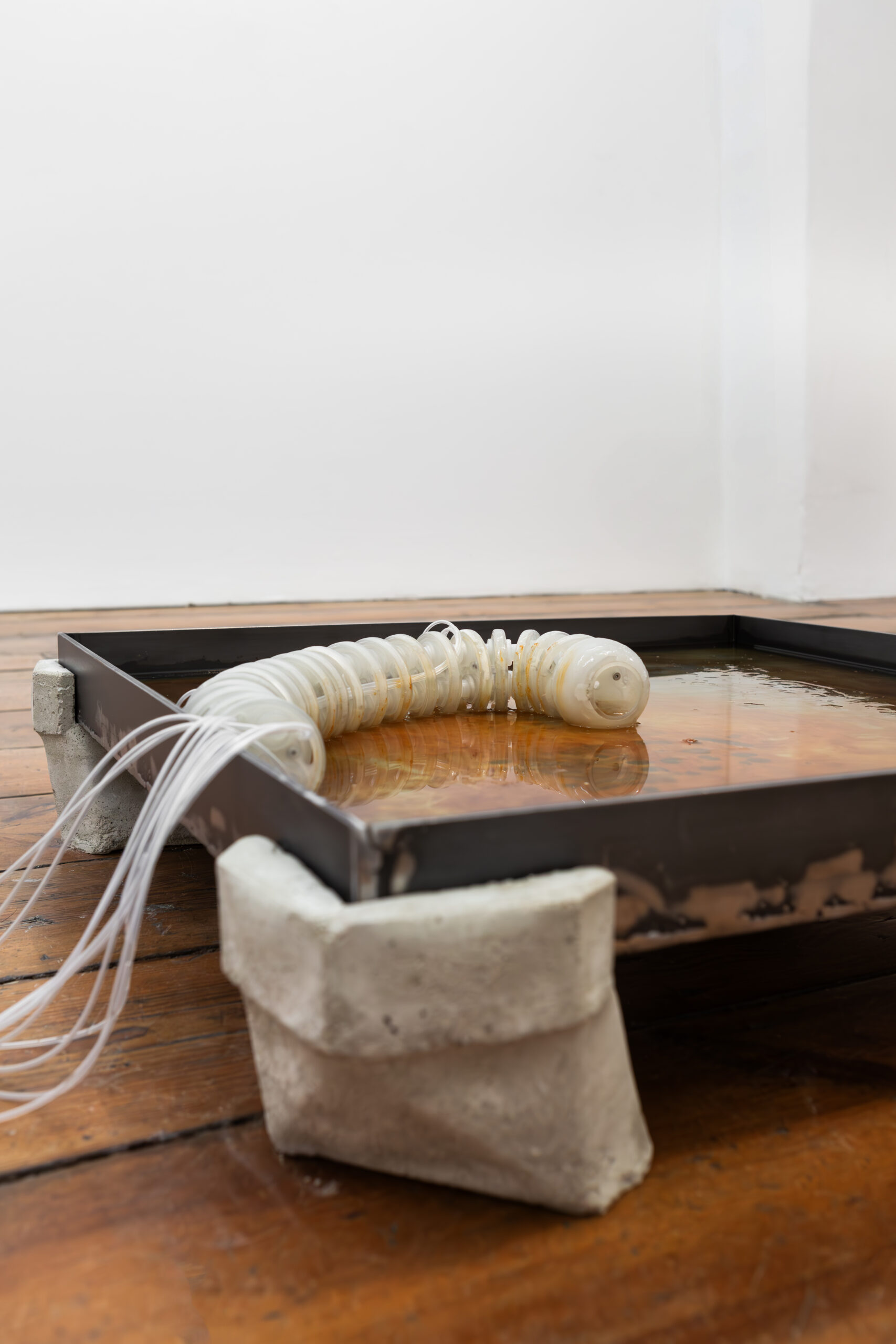 By activating uncanny and sci-fi-inspired technological objects, visually reminiscent of medical machines, Iron Stream exposes the connections between the individual materiality of blood and broader systems of power. It presents a continuous choreography between bodies, fluids, and machines that discloses the vicious management of life and death under capitalism.