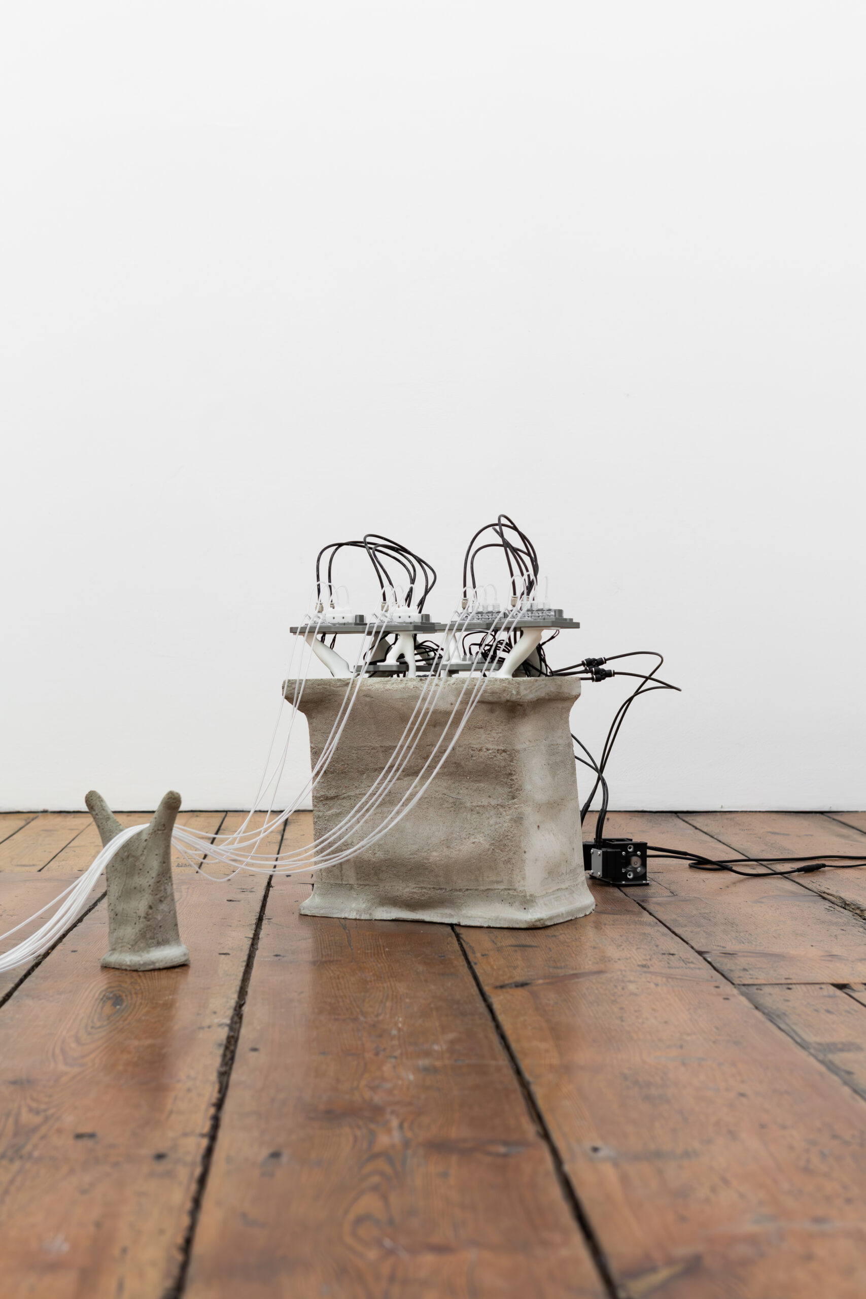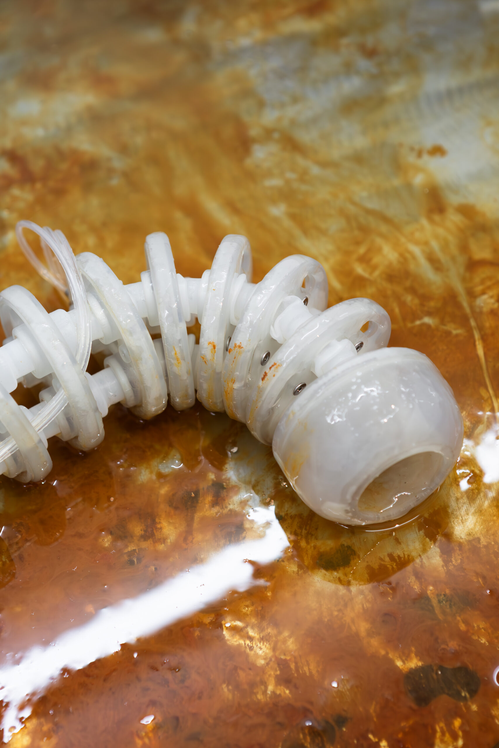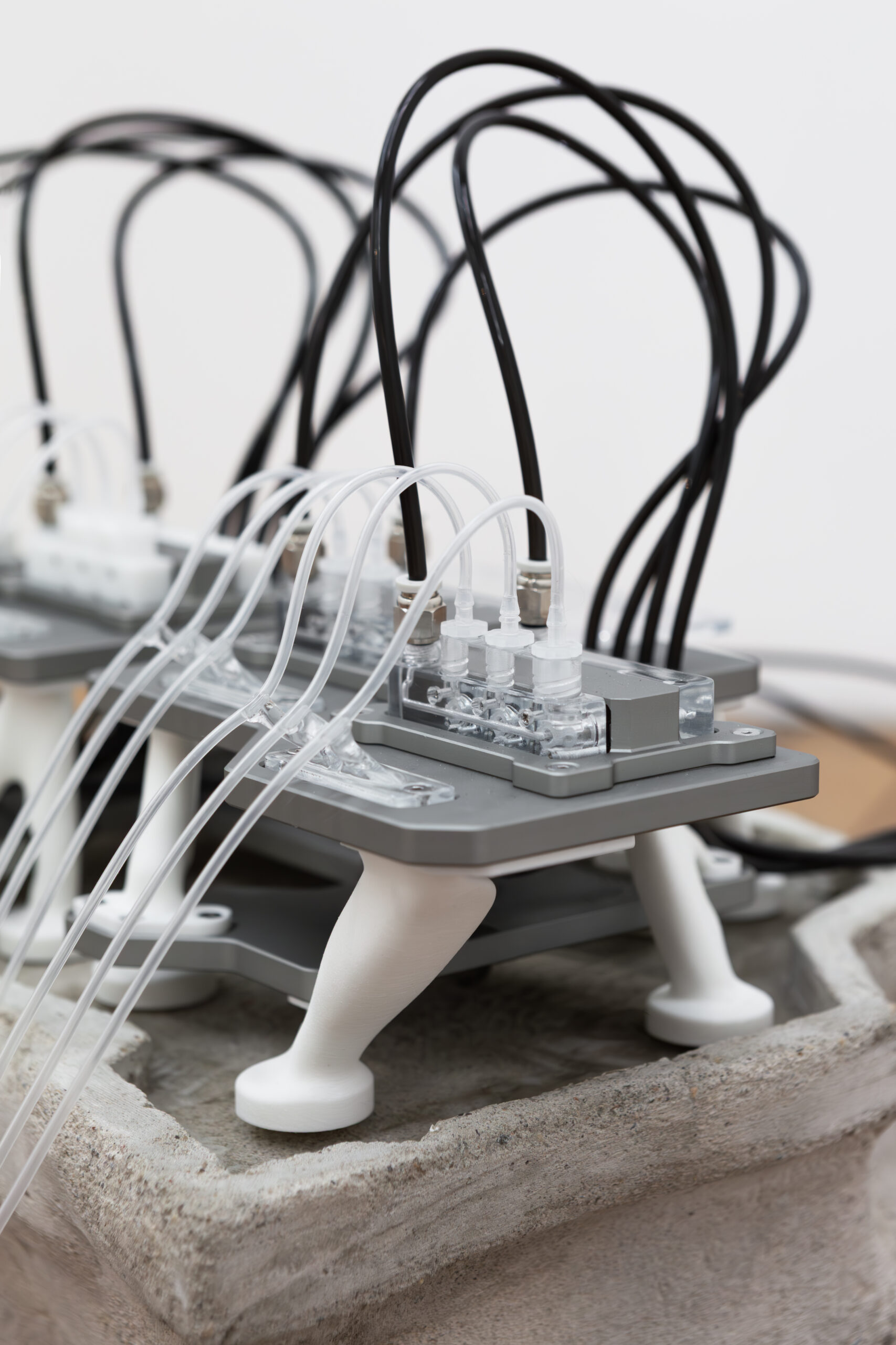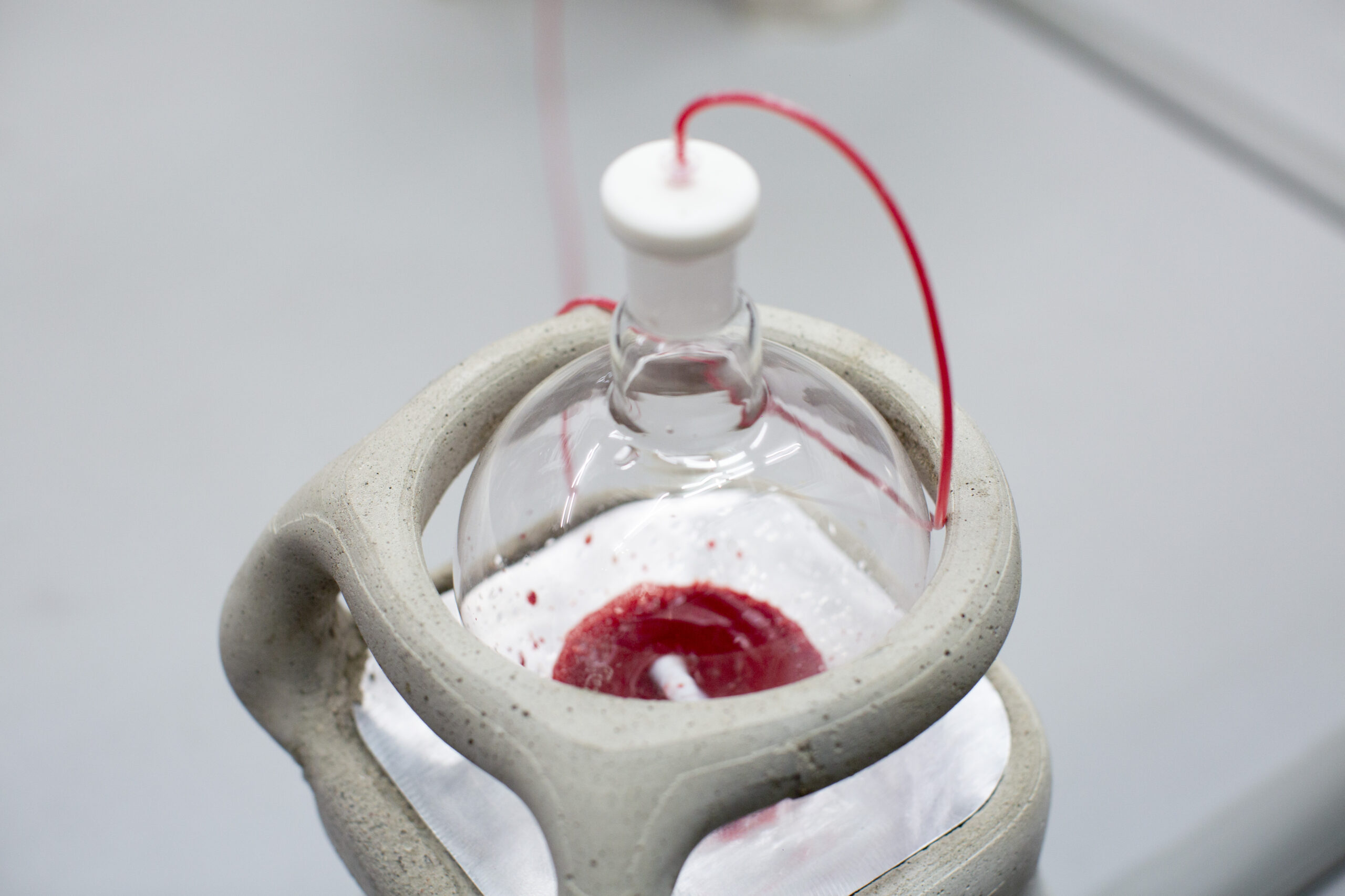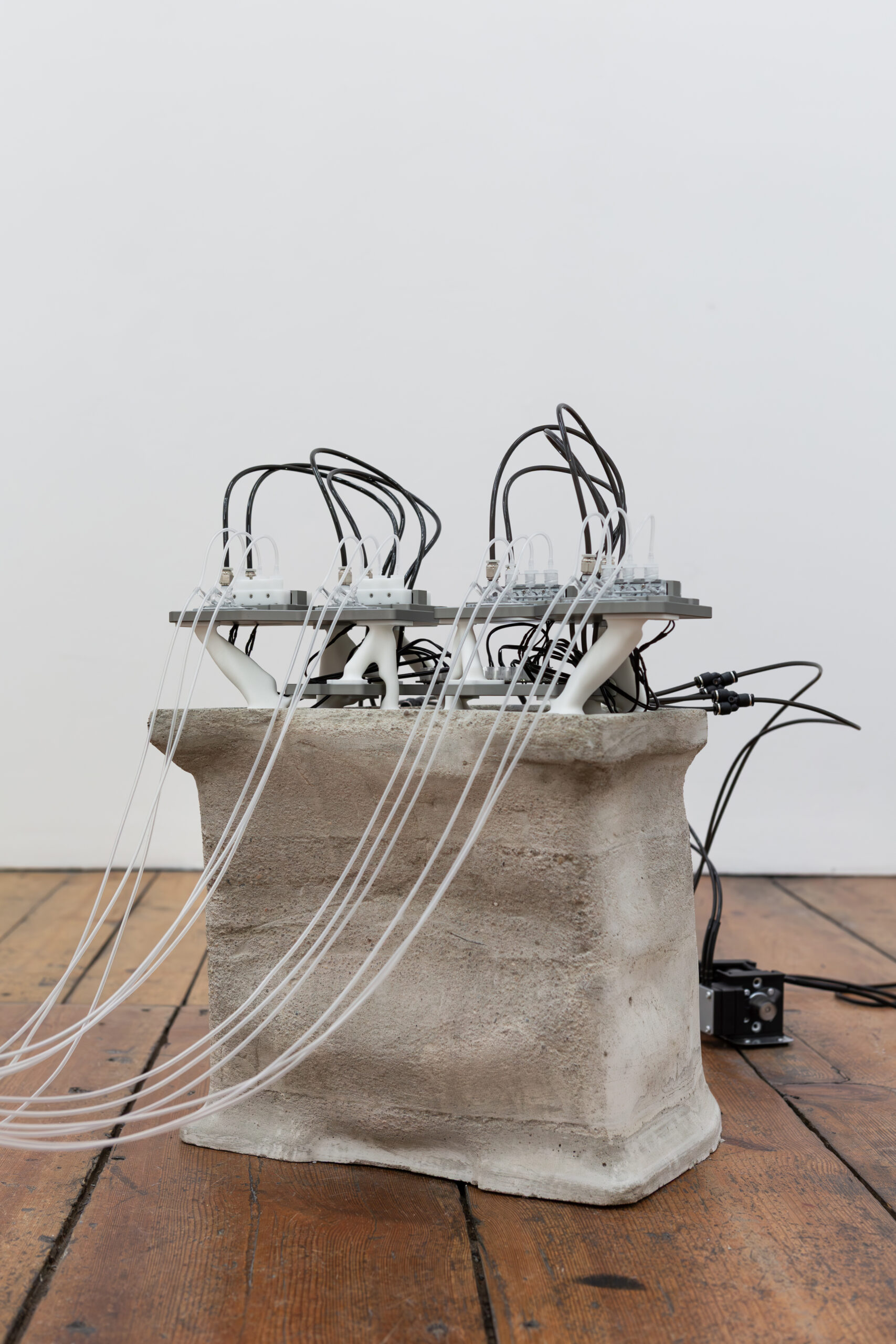 By activating uncanny and sci-fi-inspired technological objects, visually reminiscent of medical machines, Iron Stream exposes the connections between the individual materiality of blood and broader systems of power. It presents a continuous choreography between bodies, fluids, and machines that discloses the vicious management of life and death under capitalism.