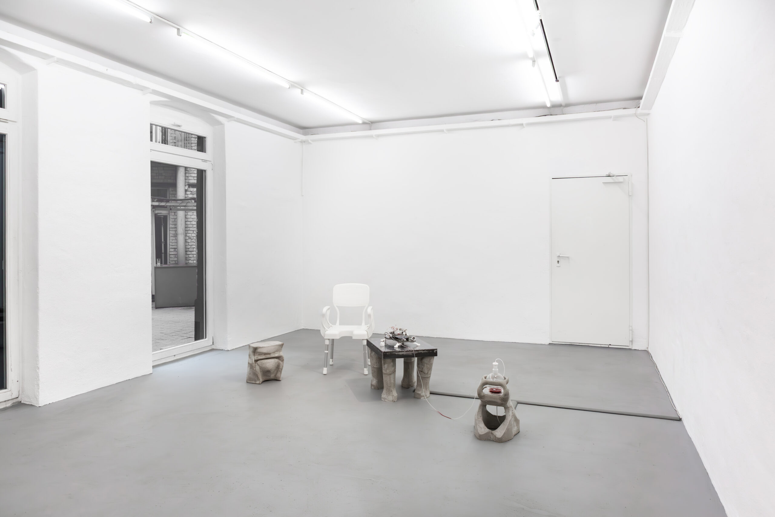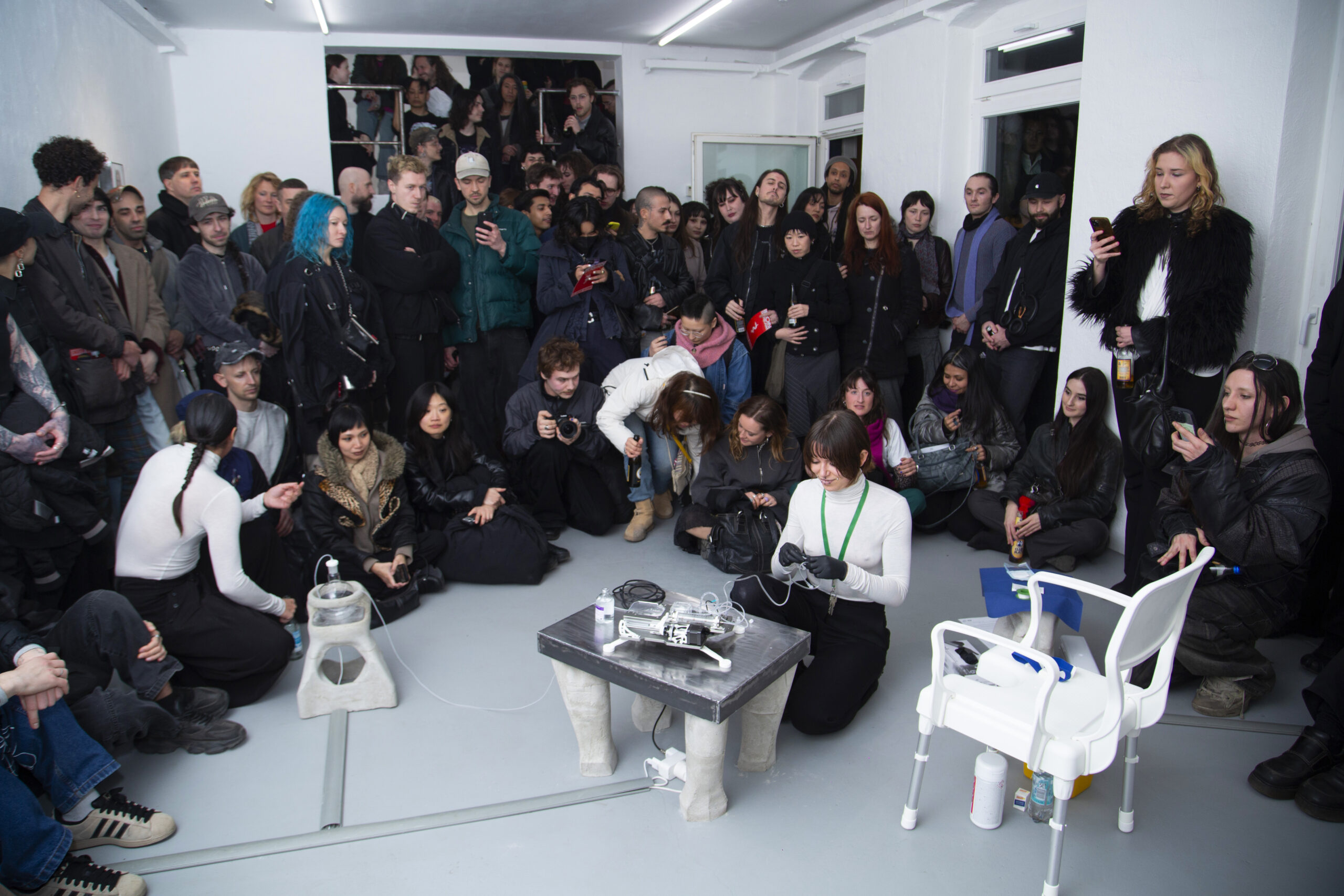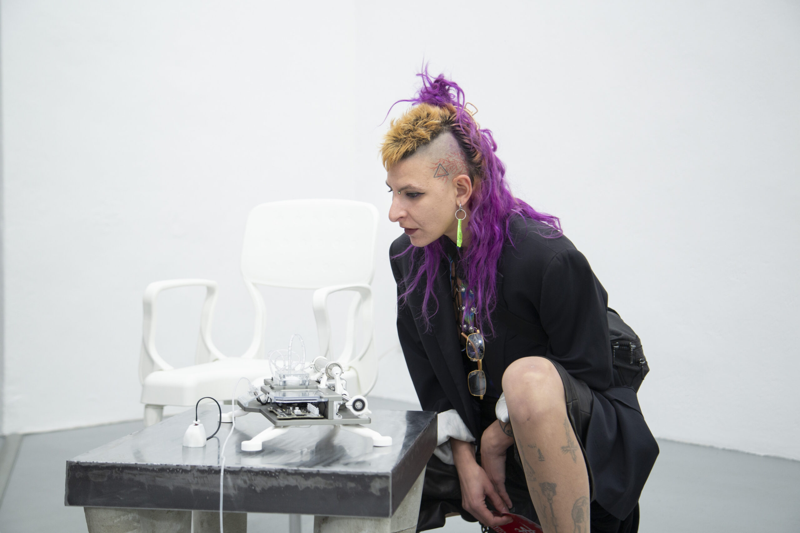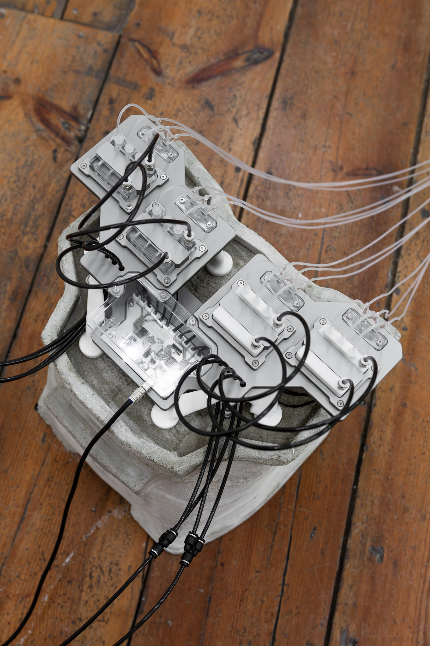 By activating uncanny and sci-fi-inspired technological objects, visually reminiscent of medical machines, Iron Stream exposes the connections between the individual materiality of blood and broader systems of power. It presents a continuous choreography between bodies, fluids, and machines that discloses the vicious management of life and death under capitalism.