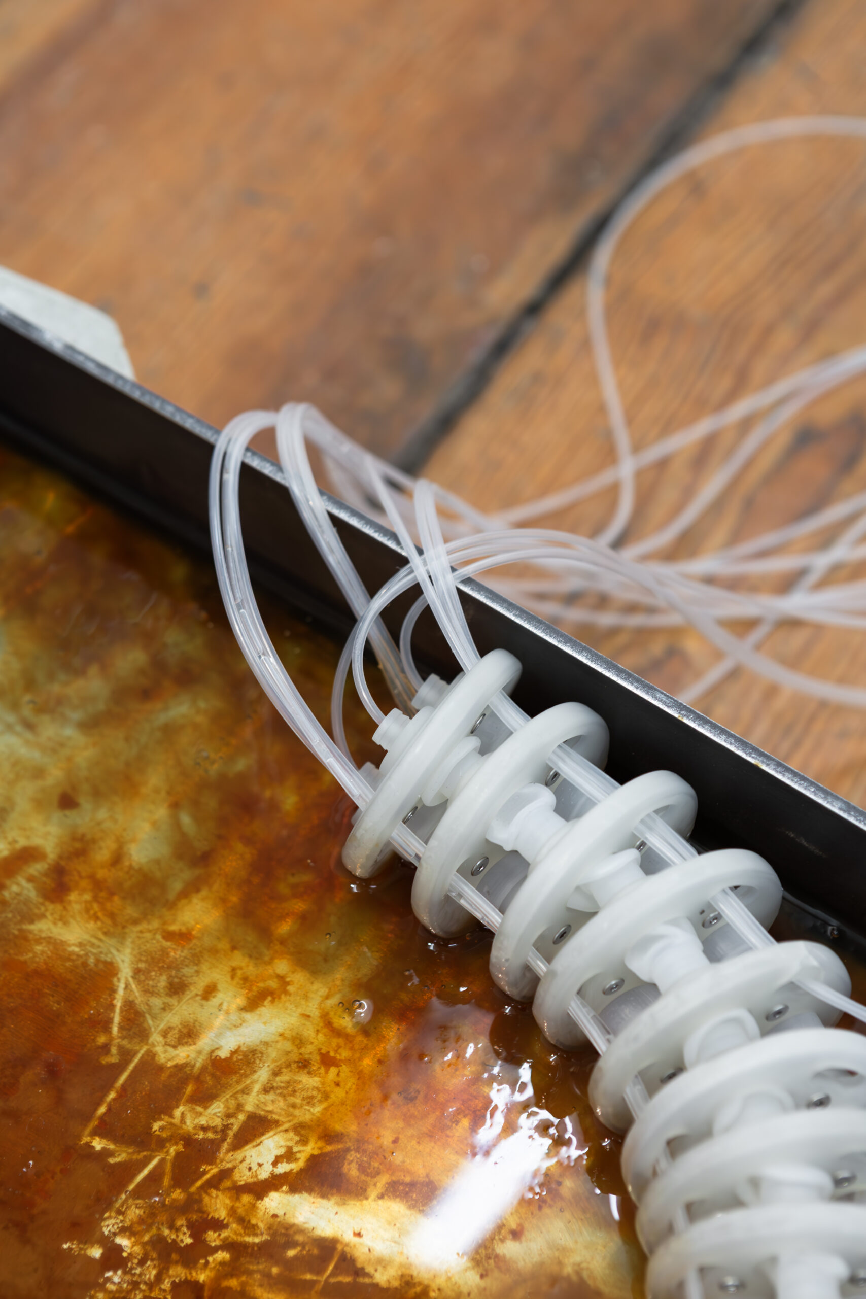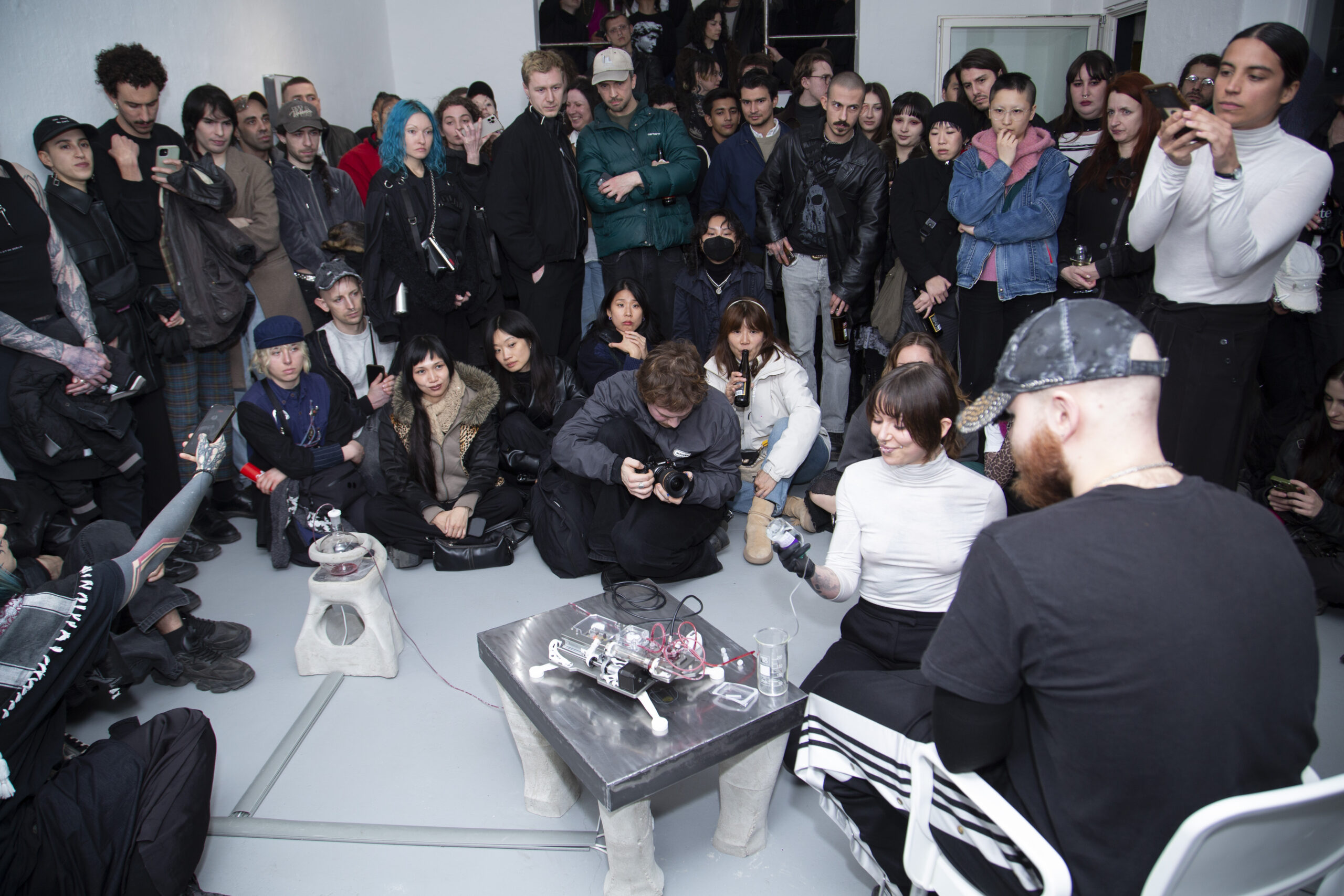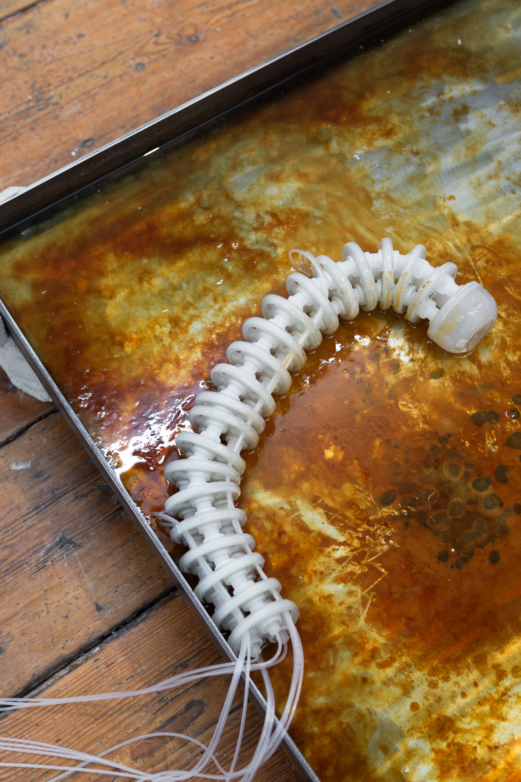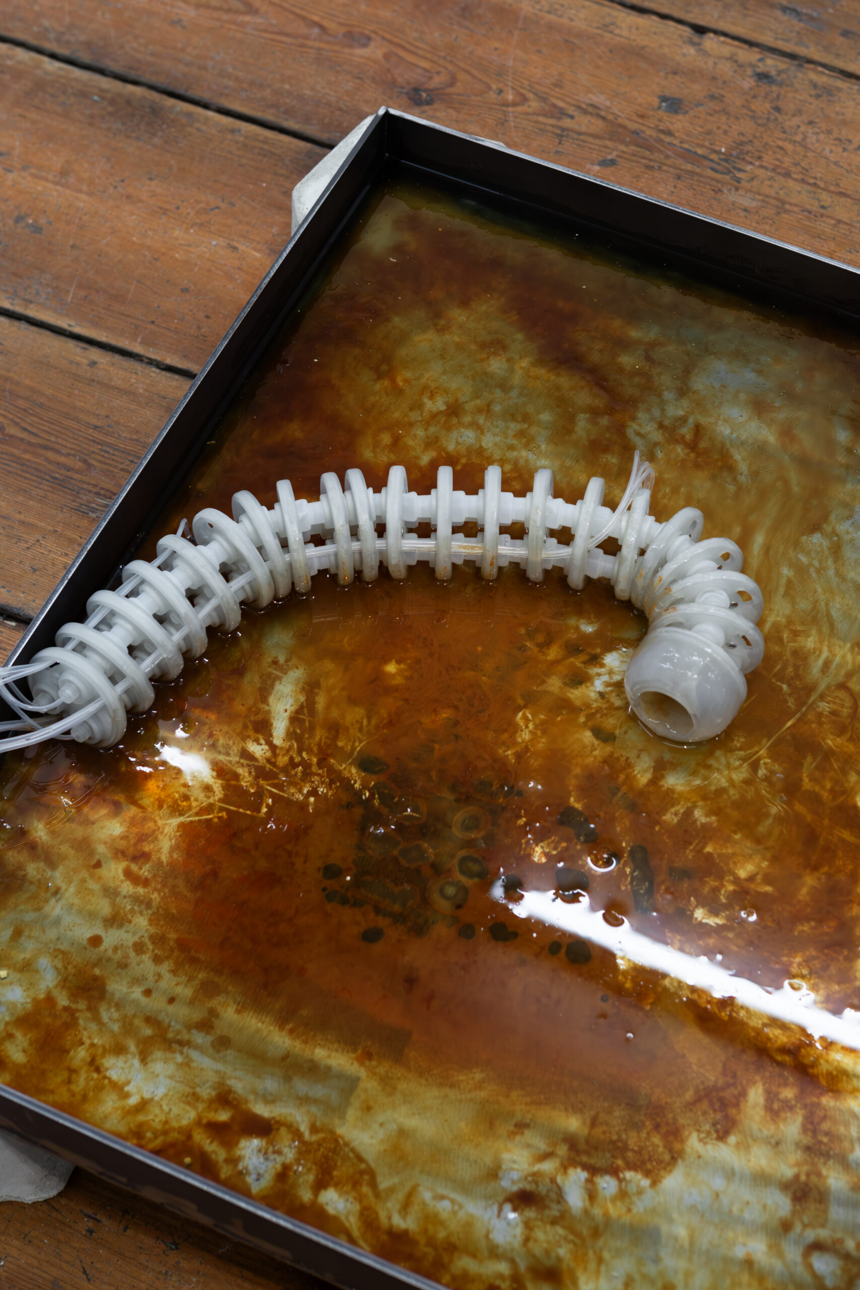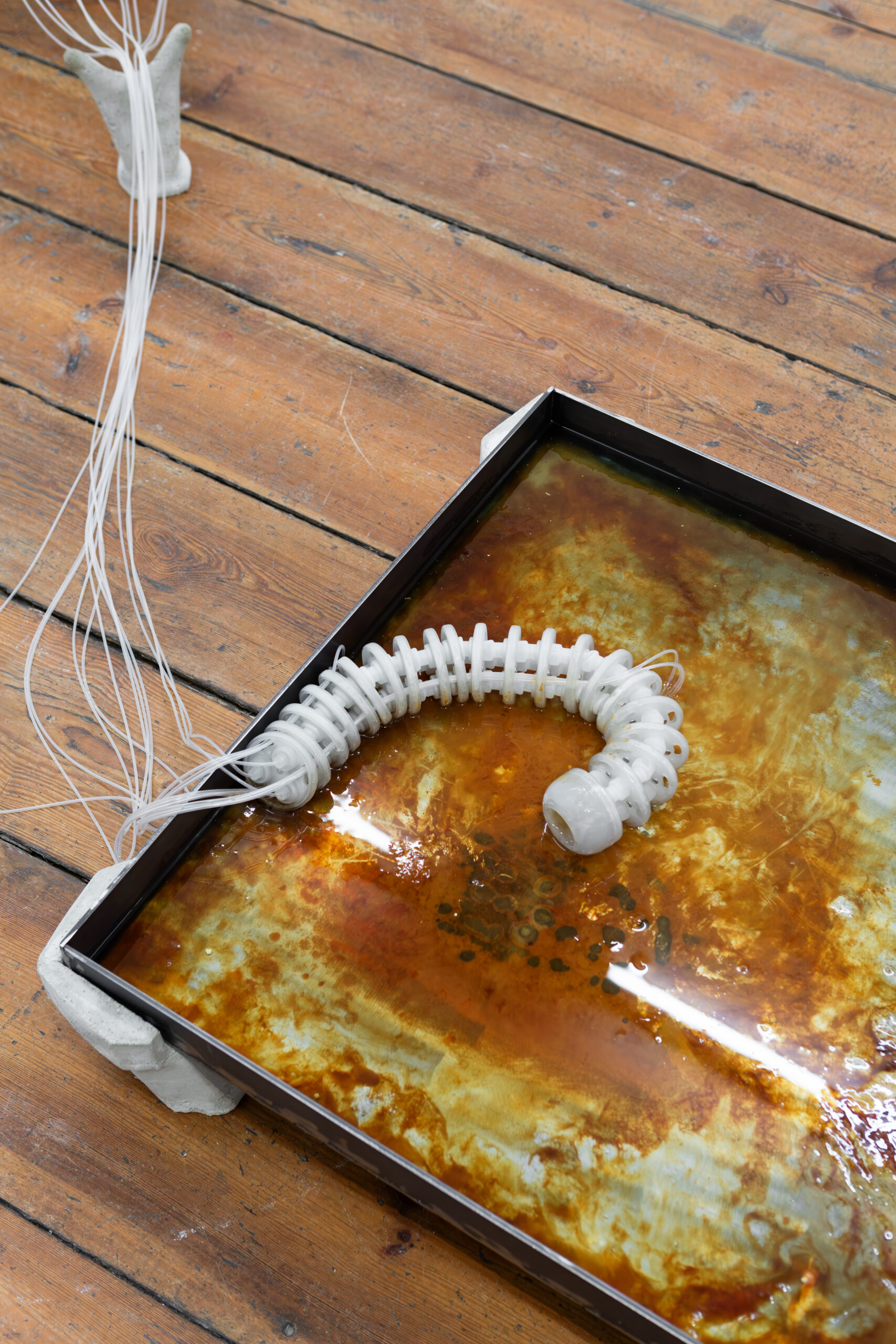 By activating uncanny and sci-fi-inspired technological objects, visually reminiscent of medical machines, Iron Stream exposes the connections between the individual materiality of blood and broader systems of power. It presents a continuous choreography between bodies, fluids, and machines that discloses the vicious management of life and death under capitalism.