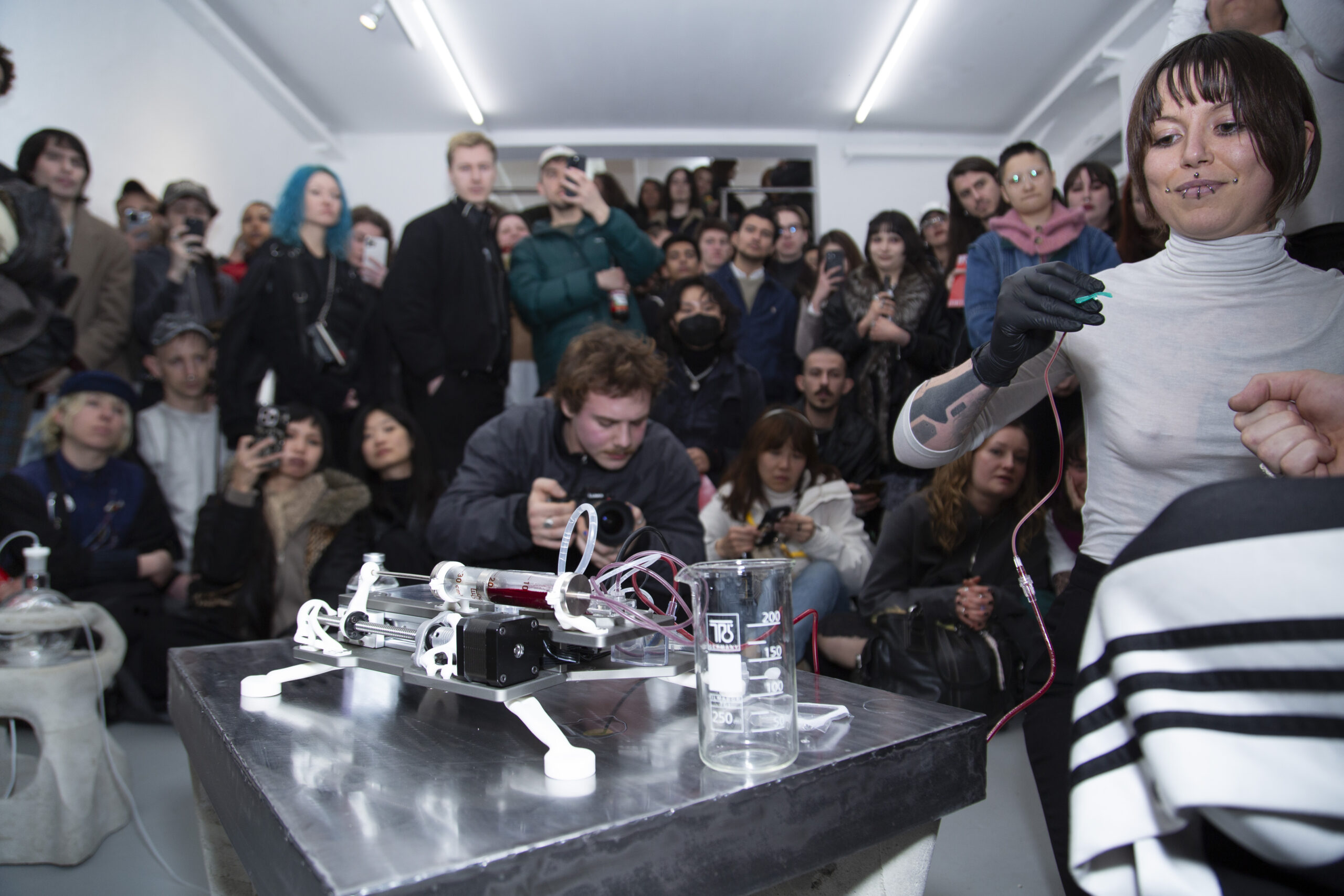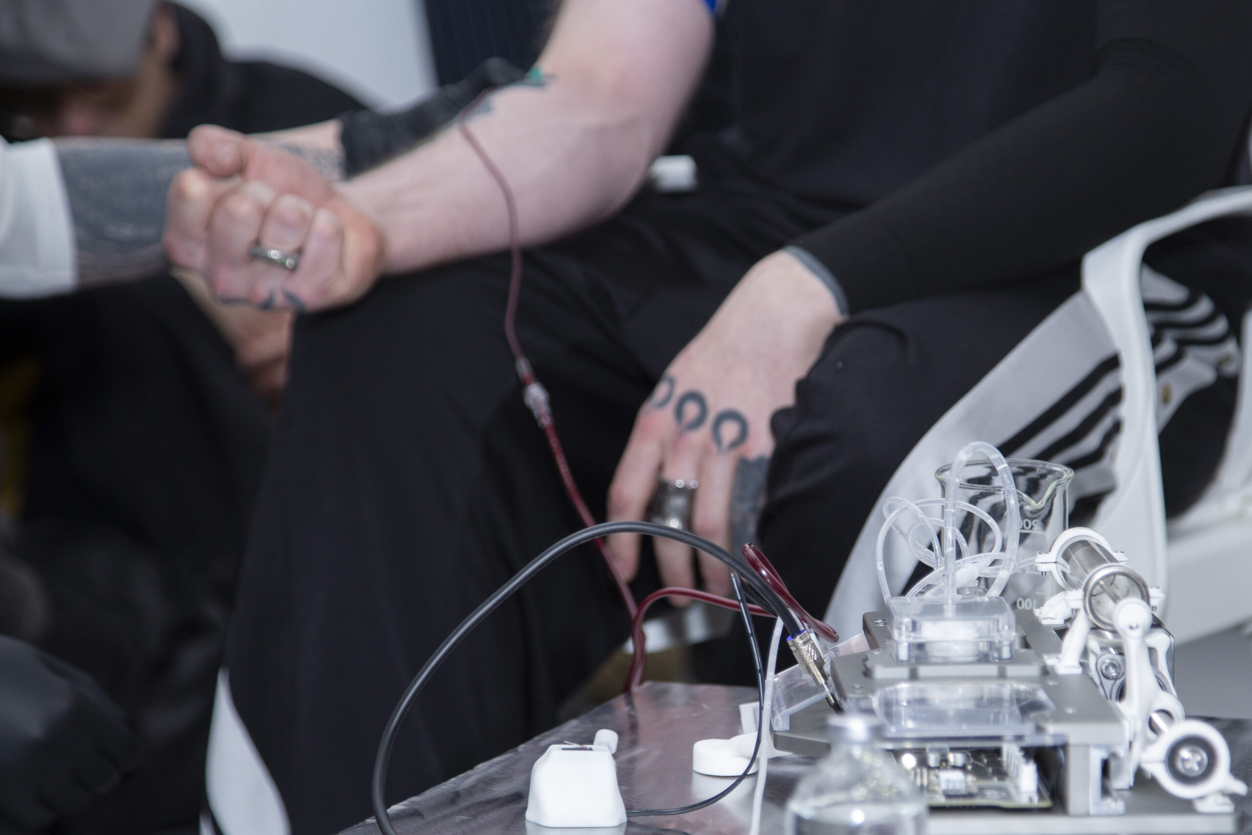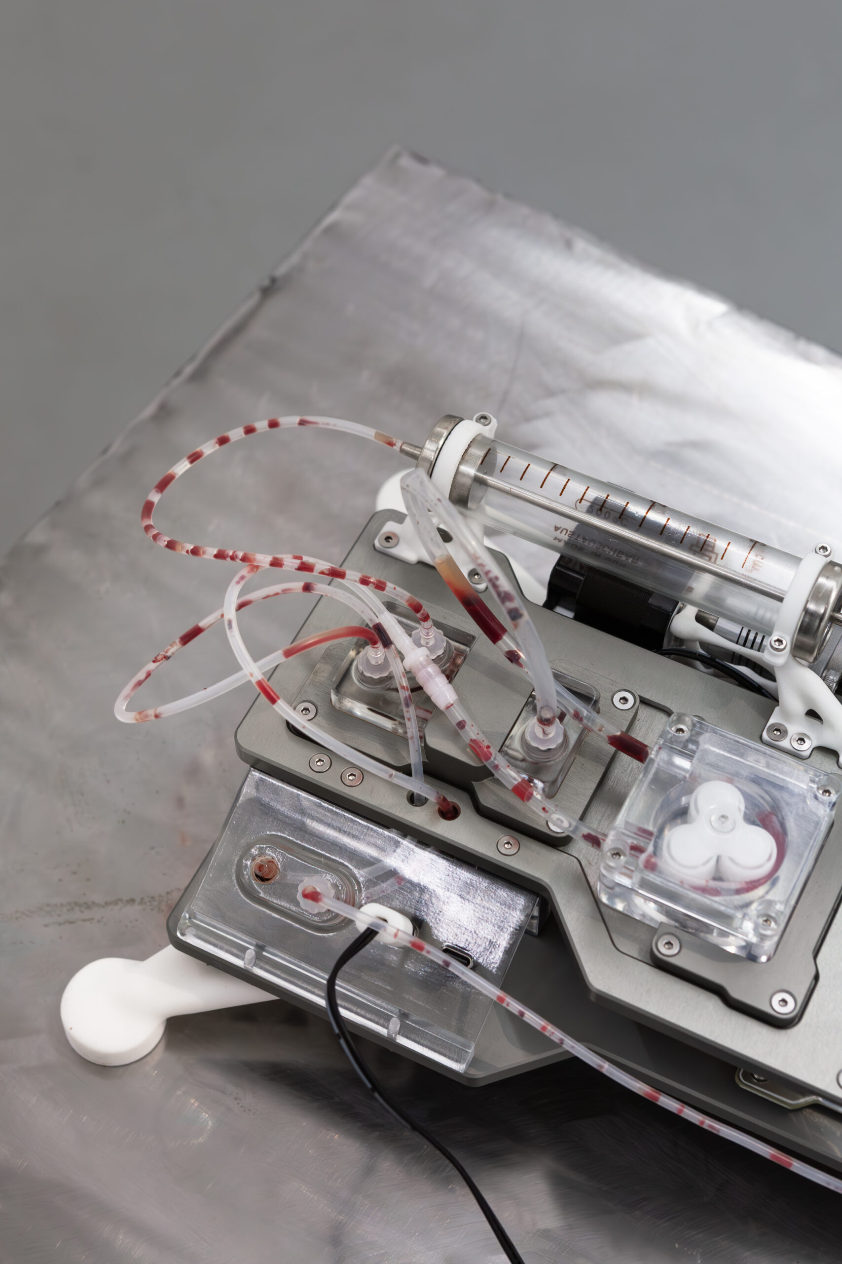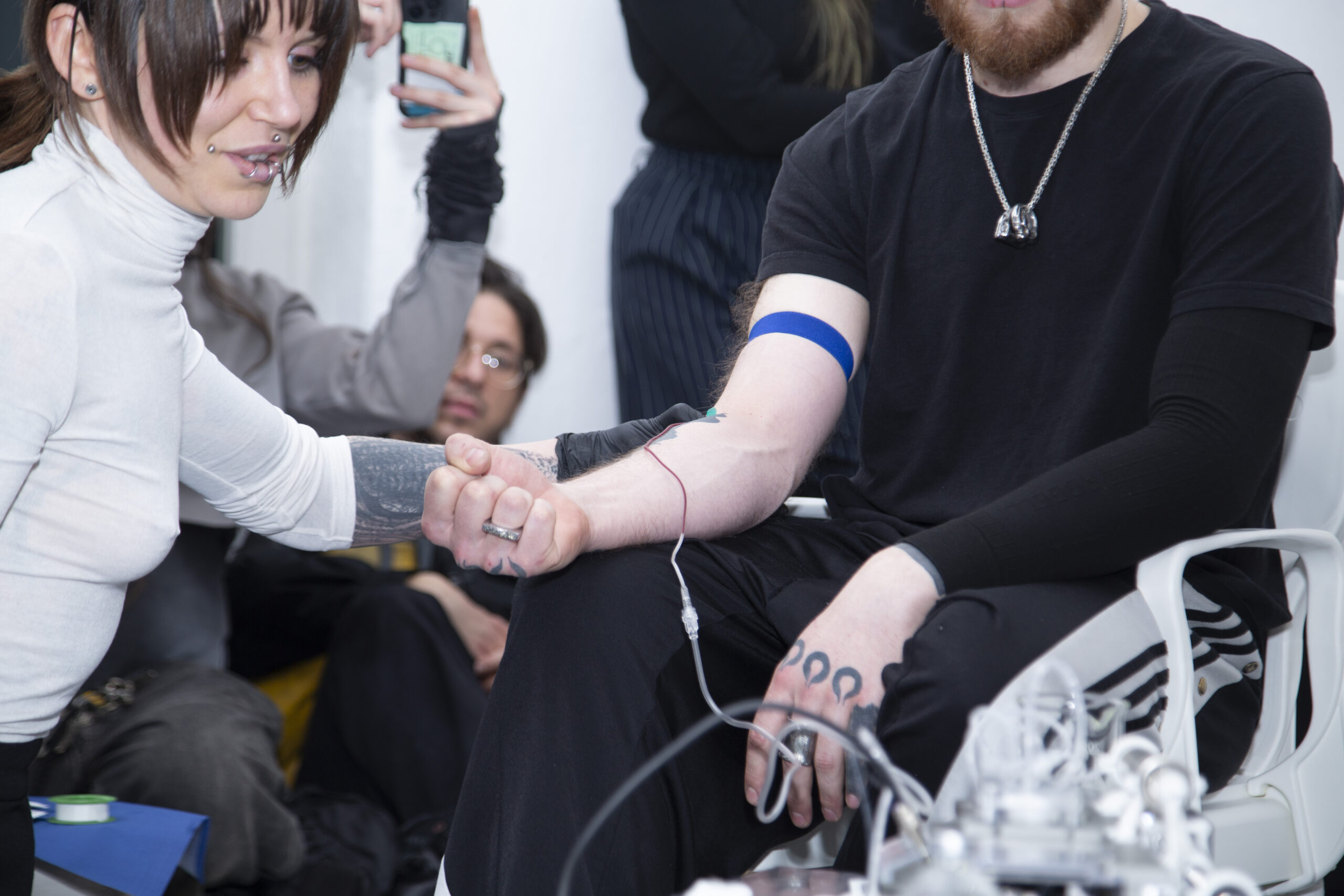 Iron Stream is a performative installation that examines the blood industry as an opaque capitalist infrastructure where technology, morality, and war intersect.